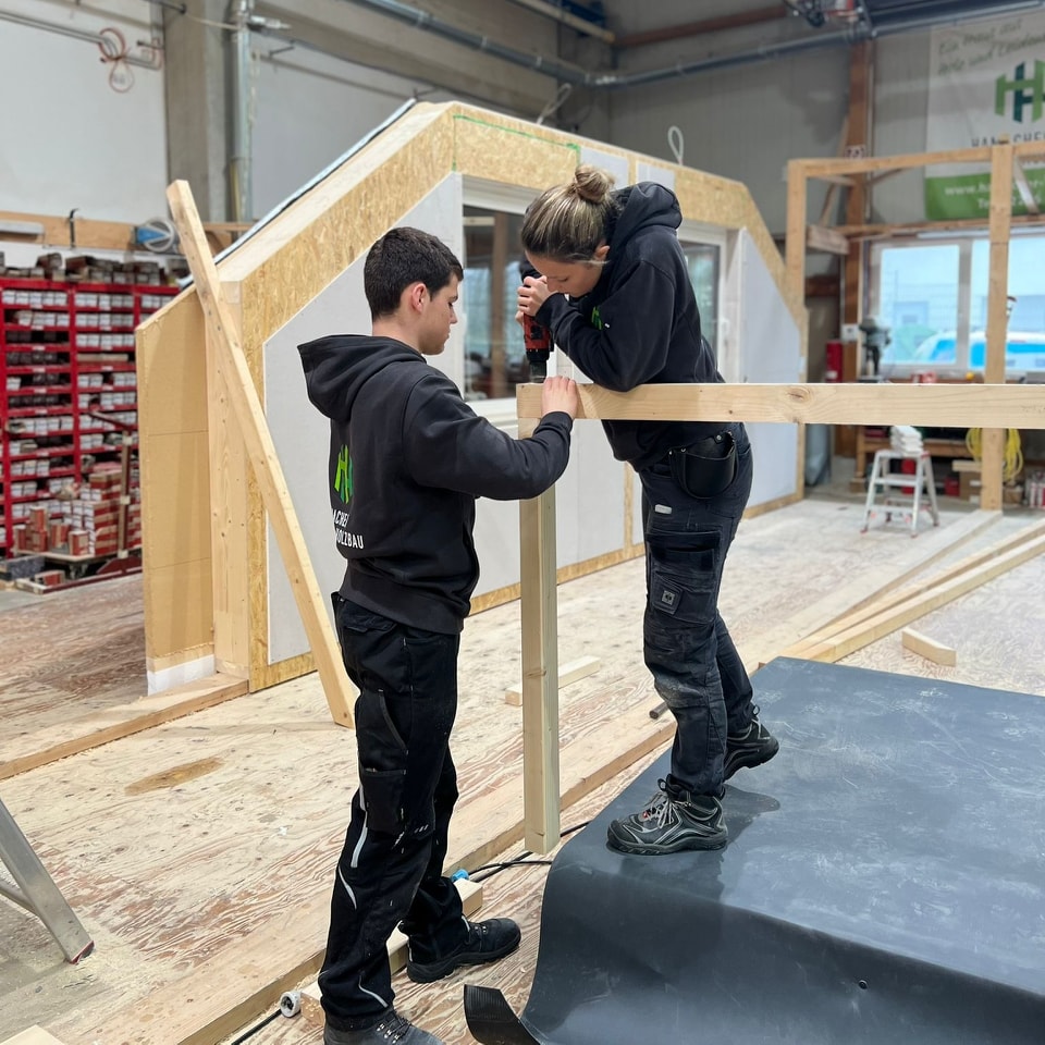 Thorben: " Das Team ist super nett. Nur das frühe Aufstehen fällt noch schwer - gehört aber dazu. In der ersten Woche habe ich Dämmarbeiten sowie Trockenbau kennengelernt. Ich freue mich auf die Arbeit". Lukas: " Super! Zuerst habe ich in der Halle die Wände für ein Haus mit zusammengebaut. Heute war ich das erste Mal mit auf dem Dach. Hier musste ich erst lernen, wie ich meine Füße zu setzen hatte....Der Beruf ist sehr abwechslungsreich und interessant"